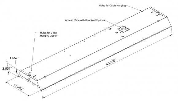 -20° Electronic Howard ballasts, 110v/120V/277V 50/60Hz, lampholders wired, 20 gauge full body steel housing, cold rolled steel in baked white enamel, 7/8'' conduit knockouts on both ends and top, Mirrored aluminum reflector.