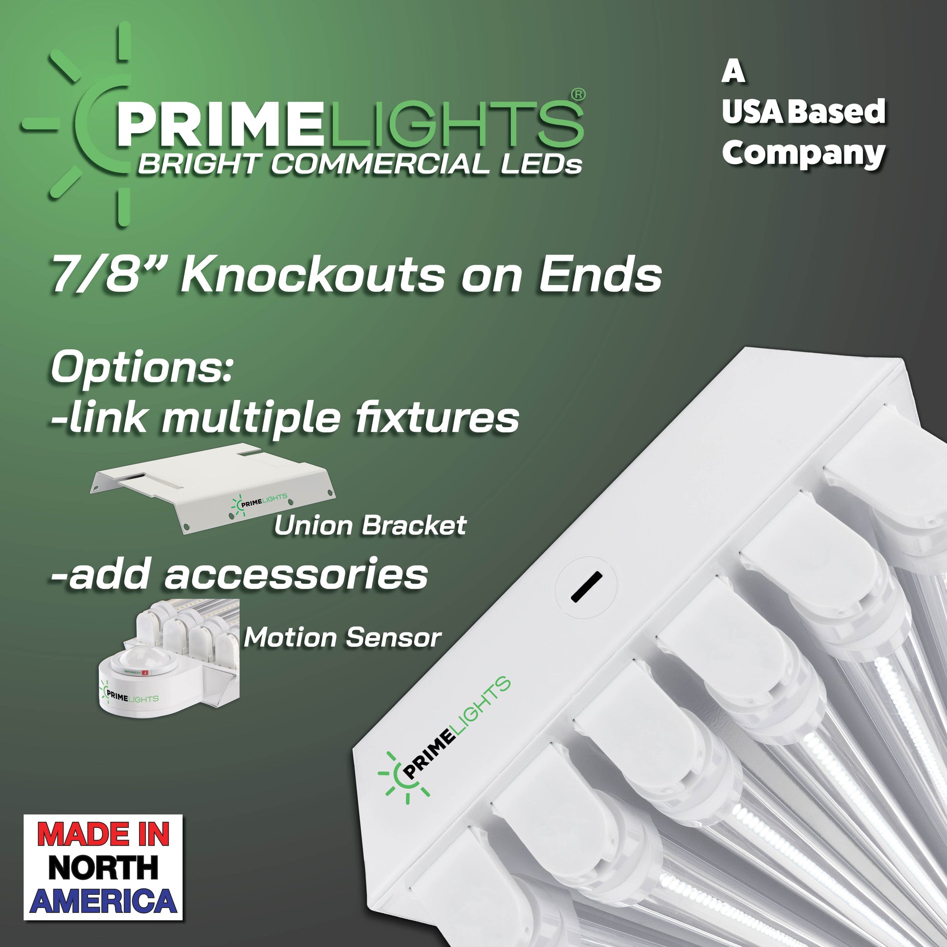 Specifications: Wired lamp holders, luminaire disconnect with 4 connection points for easy daisy chain, 20-gauge cold rolled steel in baked white enamel, 7/8'' conduit knockouts on both ends and top, mirrored aluminum reflector. Clear/Frosted LED bulbs with internal drivers - no external drivers or ballasts to maintain. You will never have to change anything inside the fixture. PrimeLights® warranties every fixture and every bulb for 5 years. 110v,120v, 240v, 277v. Long lasting, durable, and bright, this is the last light fixture you will ever need!