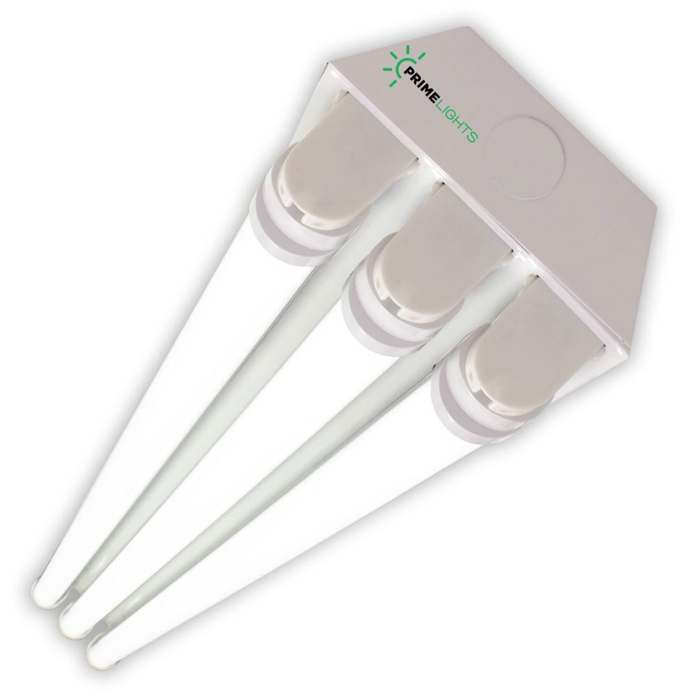 At PrimeLights, our 8 foot Bolt LED shop light combines 4 lamps in a frosted finish to bring bright and energy-efficient lighting to your property or place of business. Our Bolt LED shop lights use a simple extension plate for quick assembly and can be installed using a single point of wiring. Double rows of 4 foot lamps alleviate the hassle, cost, and fragility that is common with standard 8 foot shop lights. Additionally, most standard 8 foot lamps aren’t capable of matching the brightness, efficiency, and durability of the combined PrimeLights 4 feet lamps.