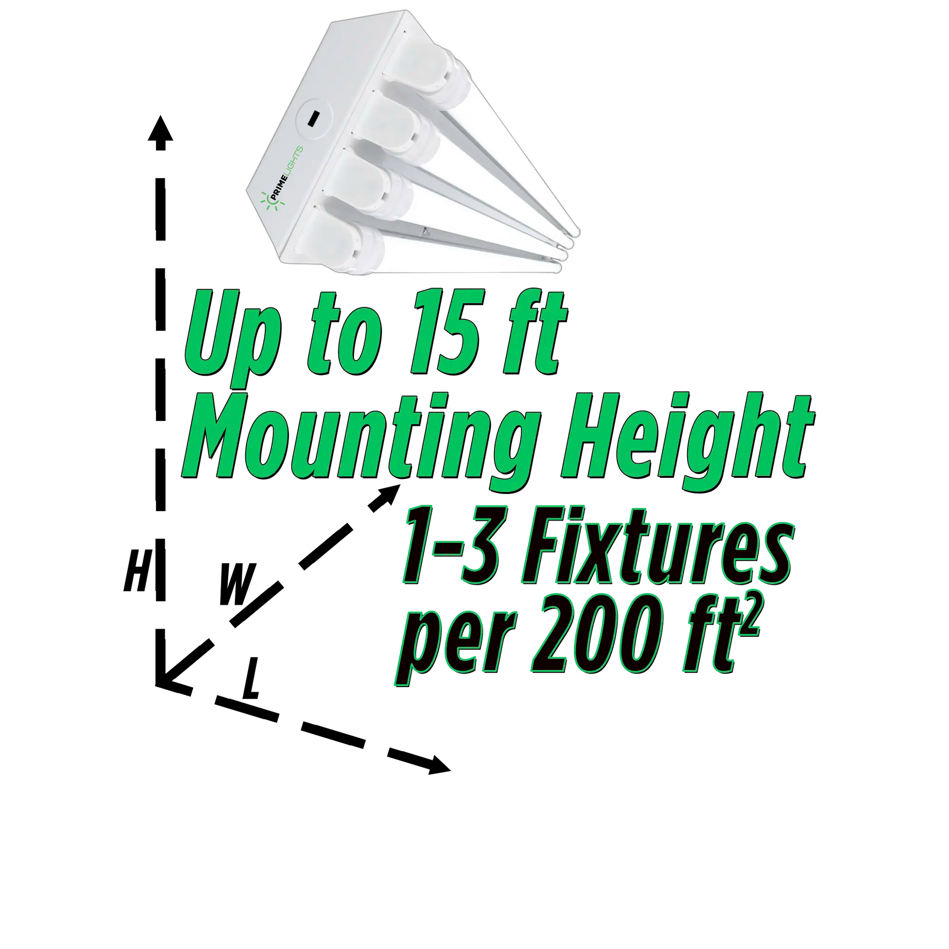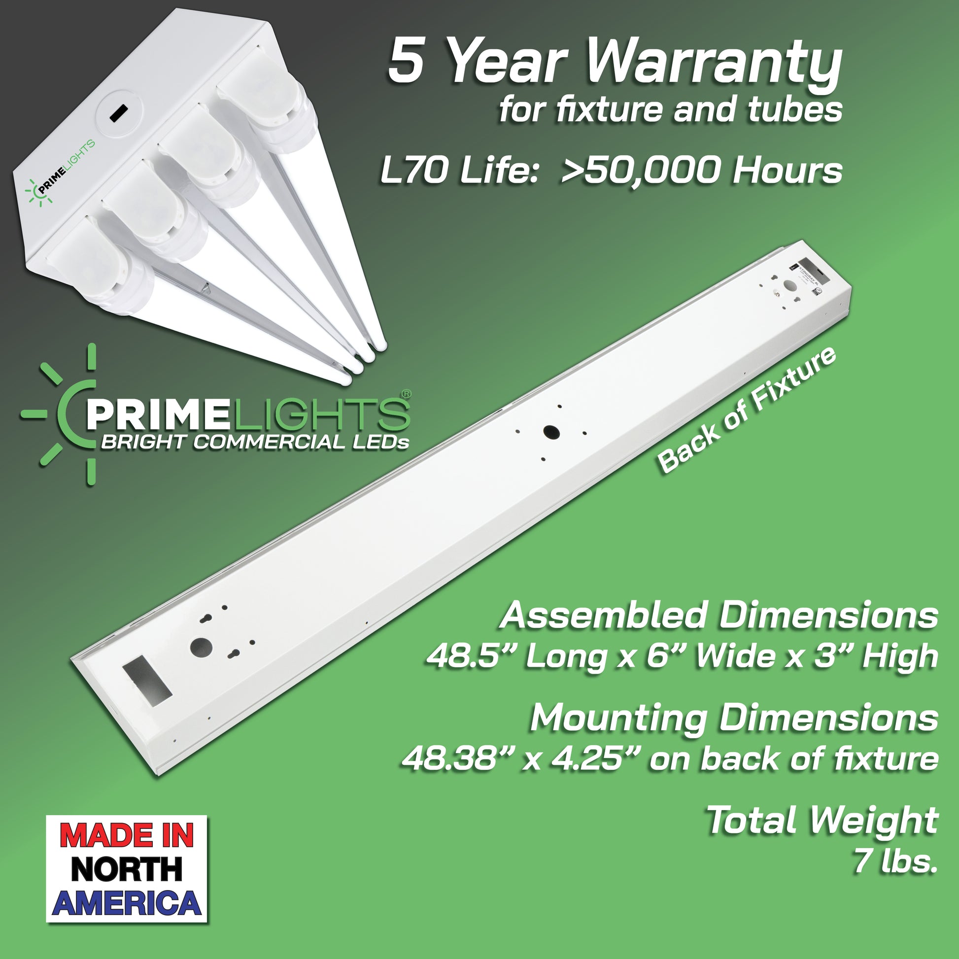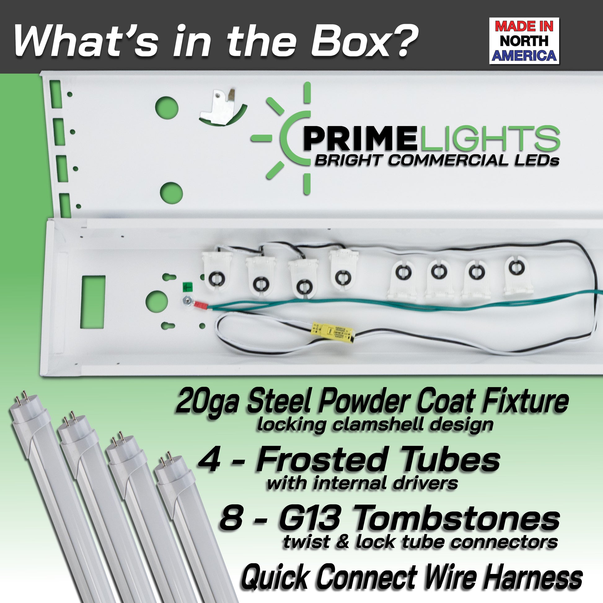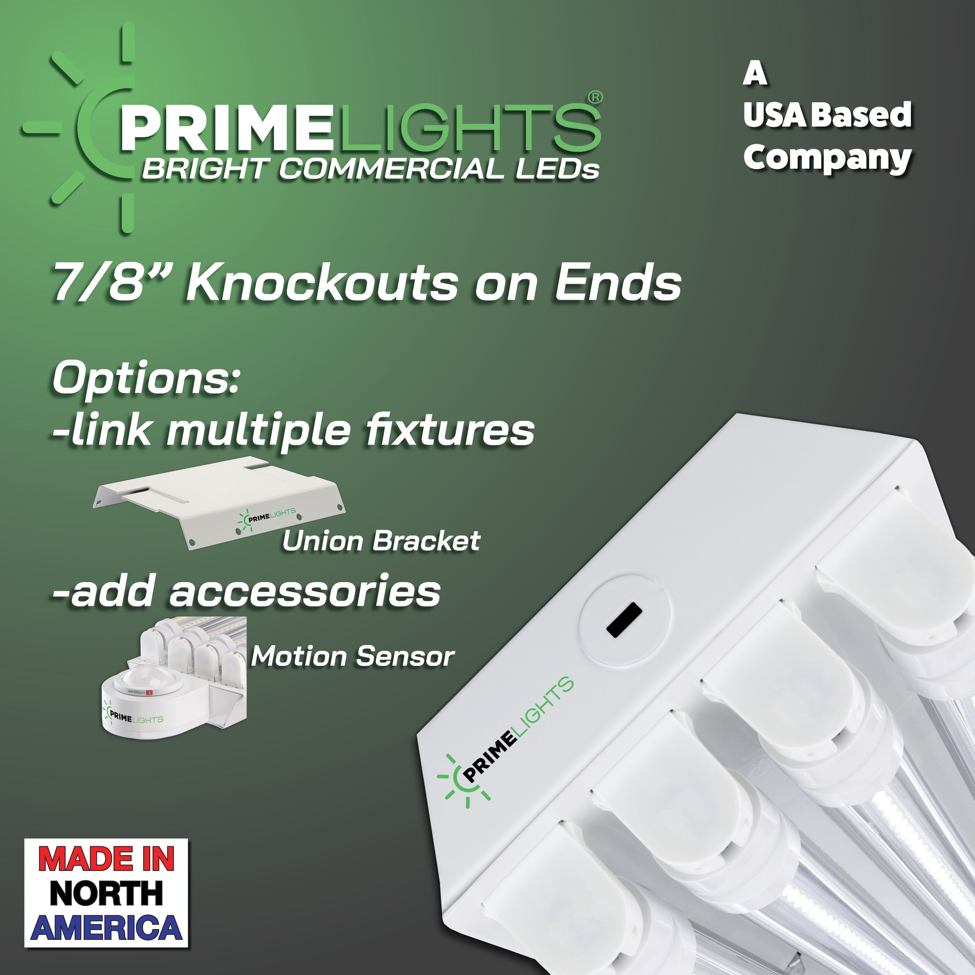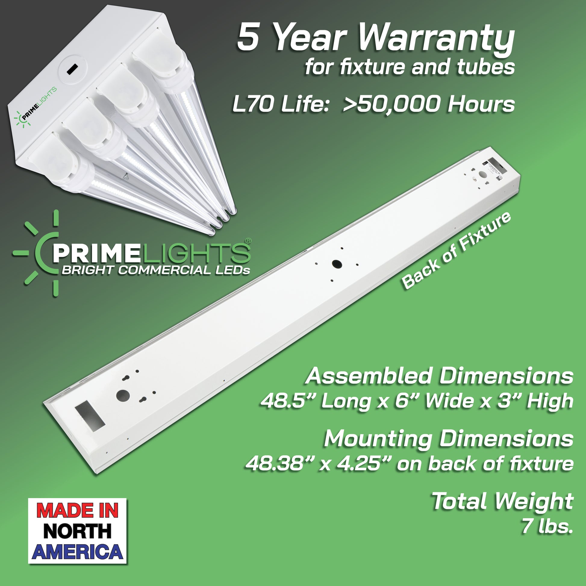 Specifications: Wired lamp holders, luminaire disconnect with 4 connection points for easy daisy chain, 20-gauge cold rolled steel in baked white enamel, 7/8'' conduit knockouts on both ends and top, mirrored aluminum reflector. Clear/Frosted LED bulbs with internal drivers - no external drivers or ballasts to maintain. You will never have to change anything inside the fixture. PrimeLights® warranties every fixture and every bulb for 5 years. 110v,120v, 240v, 277v. Long lasting, durable, and bright, this is the last light fixture you will ever need!