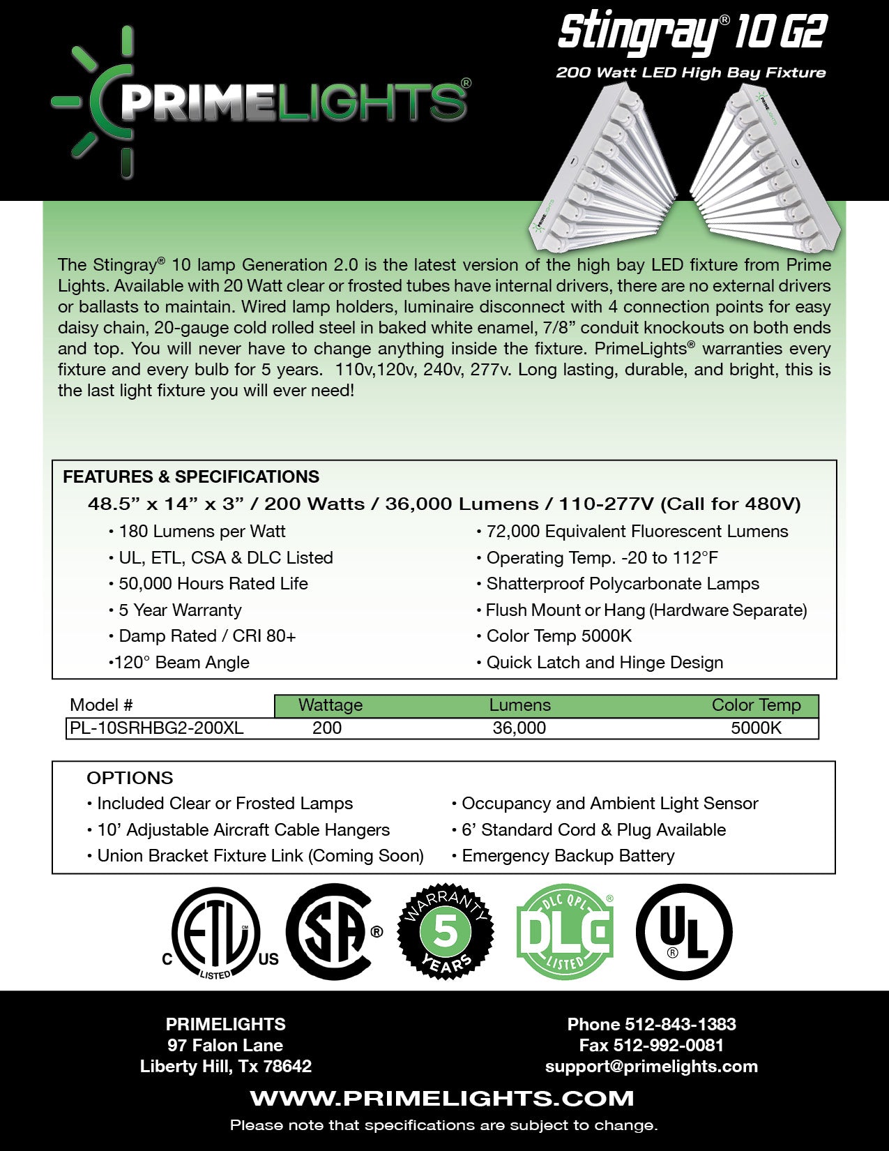 Applications: The PrimeLights® LED Stingray® 10 is the ideal fixture for ceiling heights ranging up to about 35', depending on spacing and application. Transform your shop to picture perfect daylight with clean, energy efficient, cool running, bright LED four-foot fixtures. Ideal for any size shop including metal buildings, warehouses, fab shops, garages, barns, hobby shops, car restoration, showrooms, and factories just to name a few. Frosted lamps provide reduced glare when compared to clear. For lower ceilings please see our PrimeLights® LED Stingray® 6 & 4 Series.
