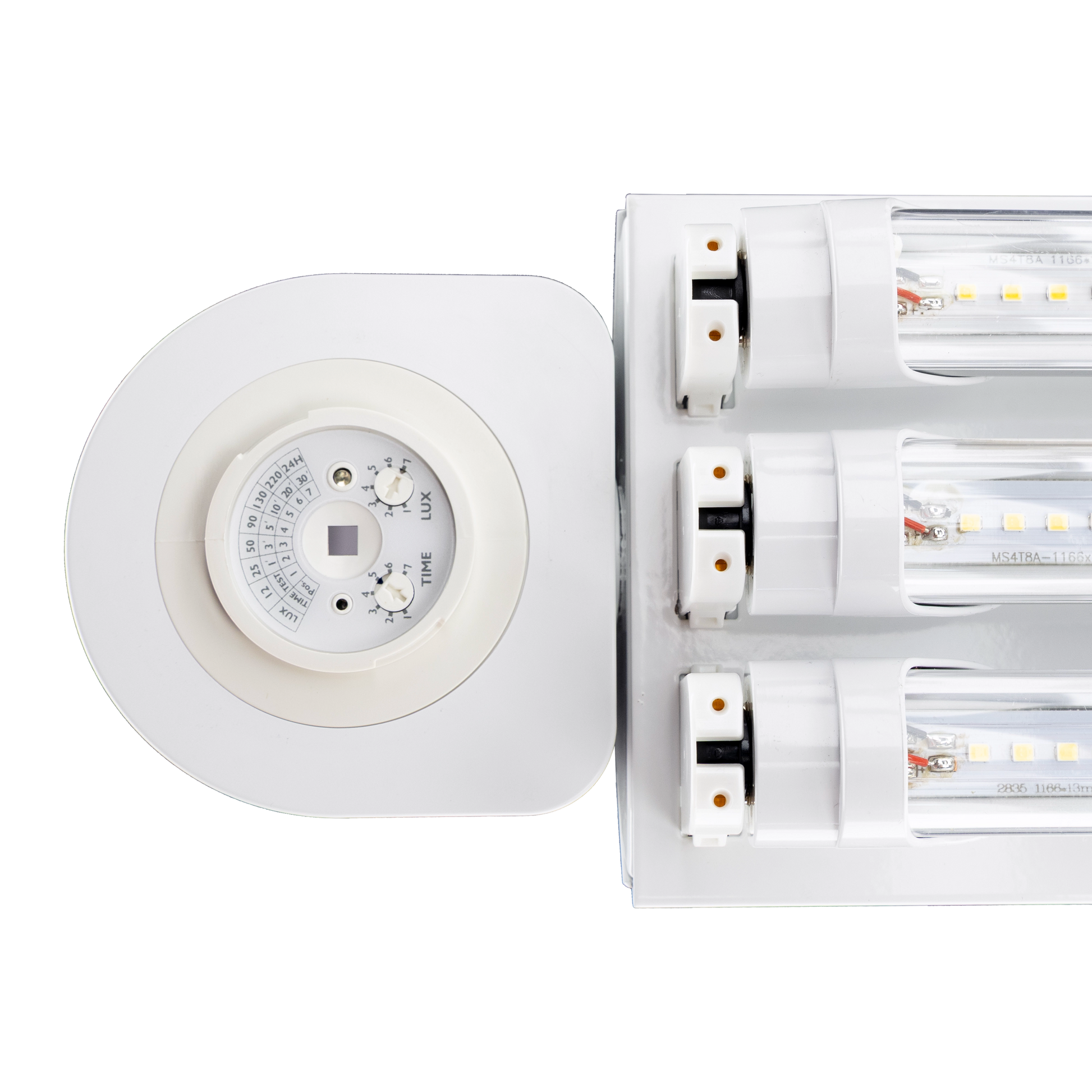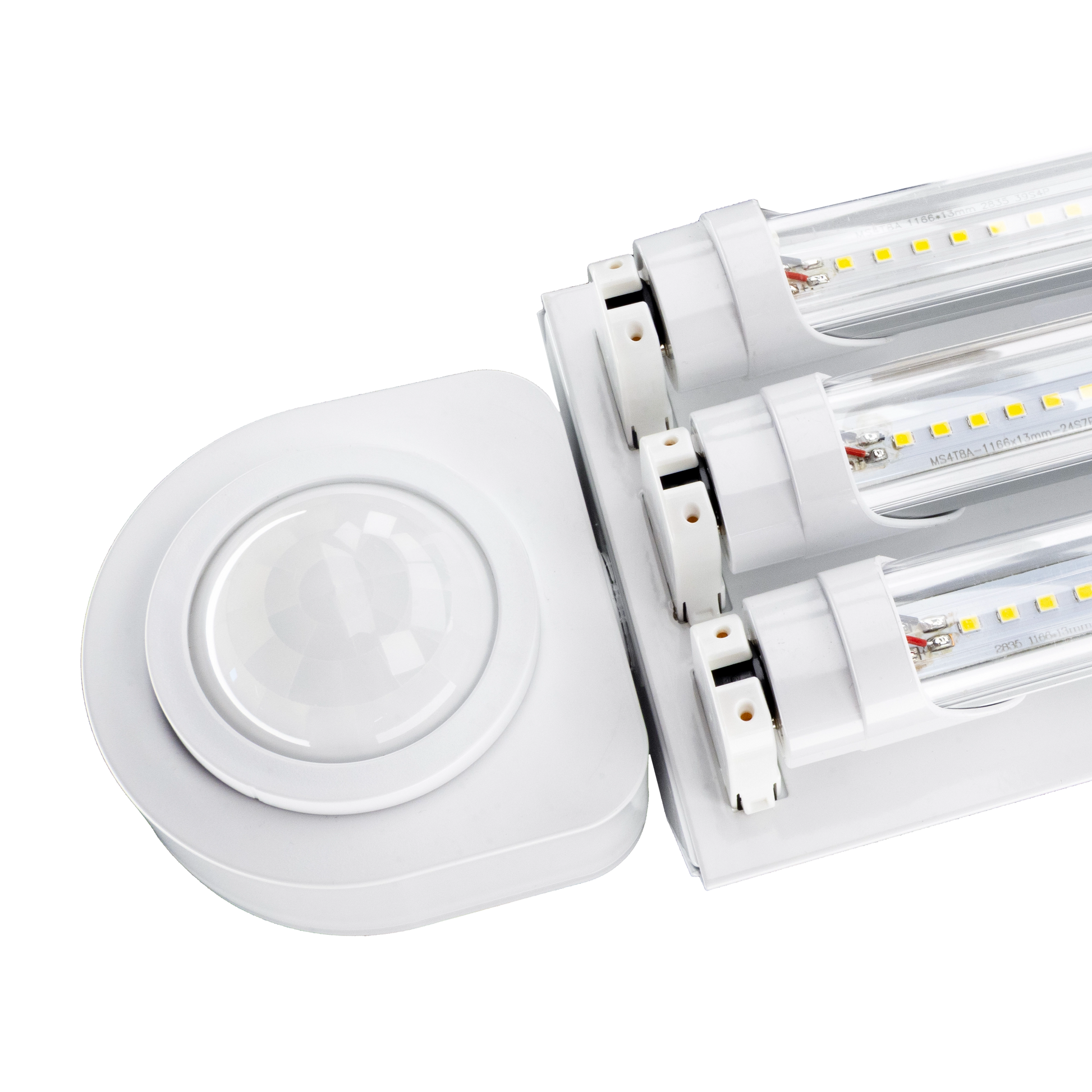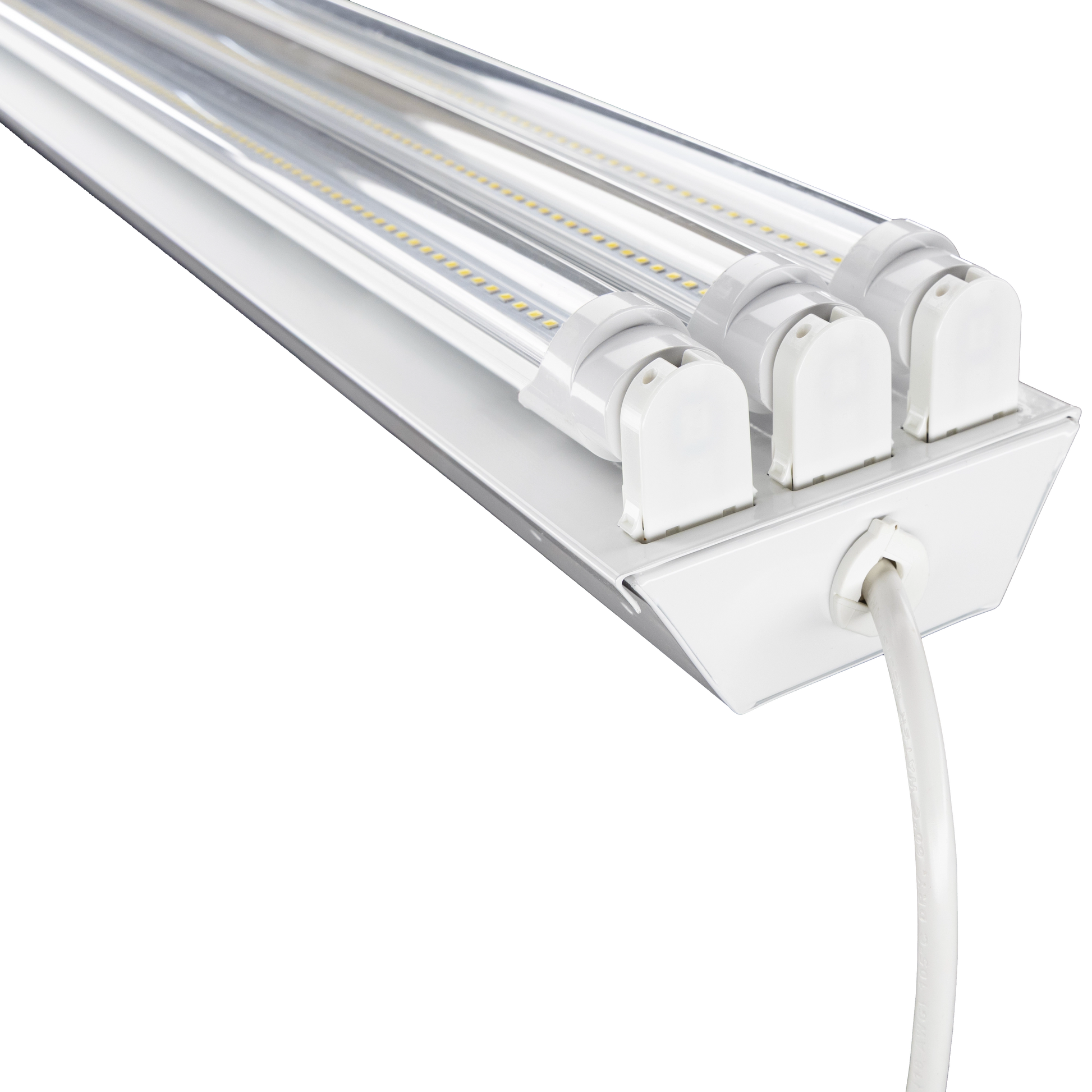 Specifications: Wired lamp holders, luminaire disconnect with 4 connection points for easy daisy chain, 20-gauge cold rolled steel in baked white enamel, 7/8'' conduit knockouts on both ends and top, mirrored aluminum reflector. Clear or Fosted LED bulbs with internal drivers - no external drivers or ballasts to maintain. You will never have to change anything inside the fixture. PrimeLights® warranties every fixture and every bulb for 5 years. 110v,120v, 240v, 277v. Long lasting, durable, and bright.