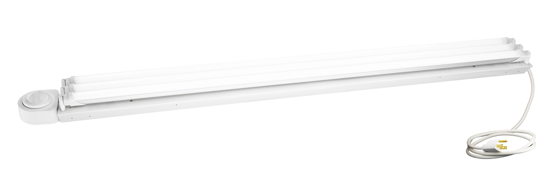 4' LED Motion Activated Occupancy Shop Light with 6' Cord & Plug. Comes with aircraft cable hangers for hanging light as well as flush mount plate.