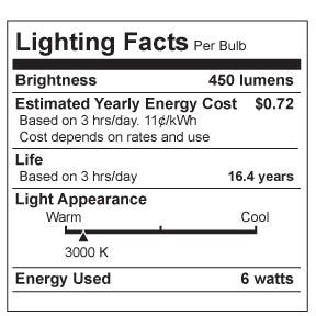 Energy Usage: 85% less than existing 40w Incandescent bulbs.