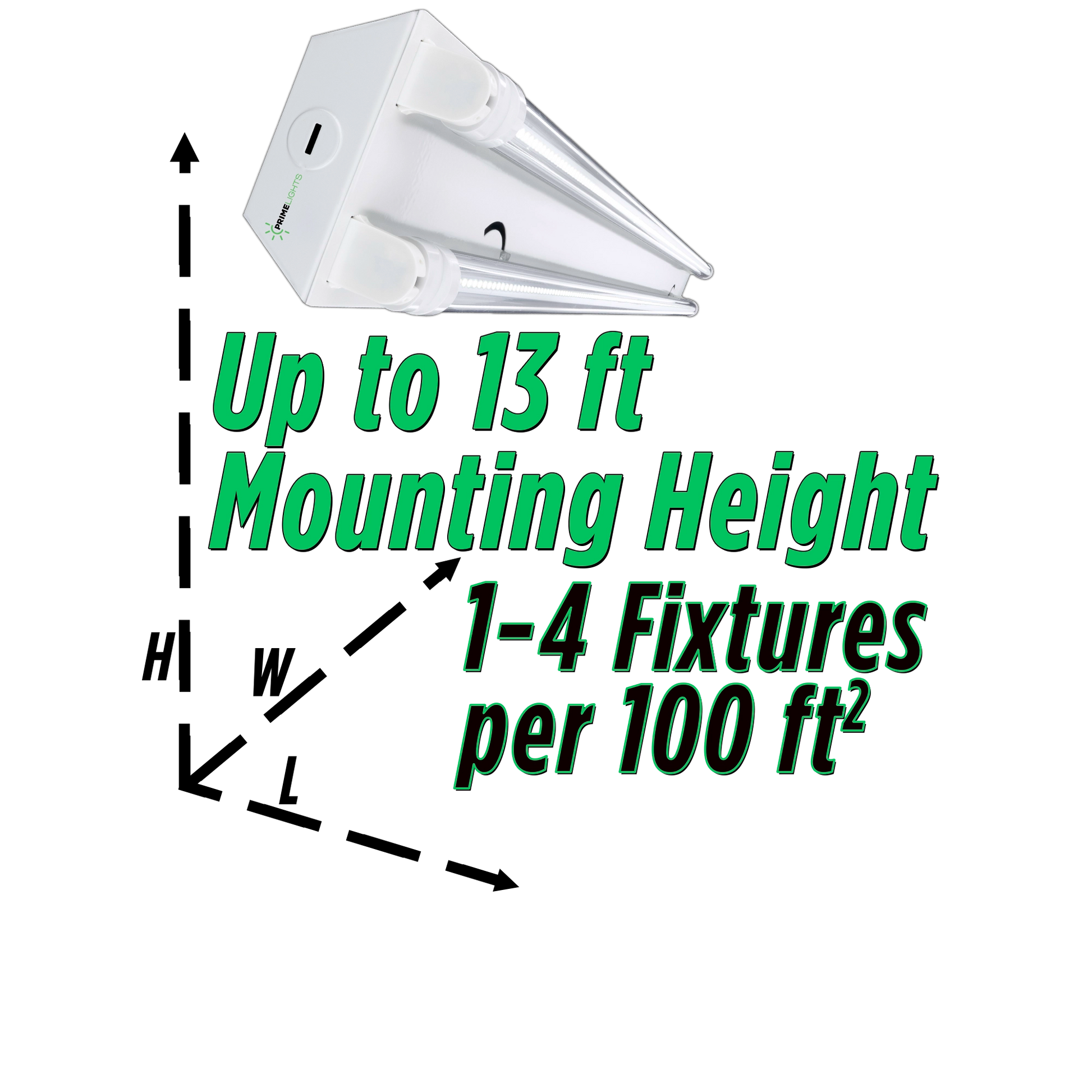 Applications:  The PrimeLights® LED Bolt® 2 is the ideal fixture for ceiling heights ranging up to about 9', depending on spacing and application.  Transform your shop to picture perfect daylight with clean, energy efficient, cool running, bright LED four-foot fixtures.  Ideal for any size shop including metal buildings, warehouses, fab shops, garages, barns, hobby shops, car restoration, showrooms, and factories just to name a few.  Frosted lamps provide reduced glare when compared to clear.  For higher ceilings please see our PrimeLights® LED Bolt® 3 (up to 12') or Stingray® 4 & 6 Series (up to 20' & 35').